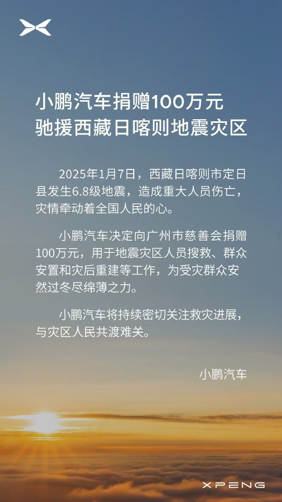 新浪科技讯 1月8日下昼音书,小鹏汽车当天发文称开yun体育网,2025年1月7日,西藏日喀则市定日县发生6.8级地震,酿成环节东谈主员伤一火,灾情牵动着宇宙东谈主民的心。小鹏汽车决定向广州市慈善会捐赠100万元,用于地震灾地东谈主员搜救、大师安置和灾后重建等责任,为受灾大师浮松过冬尽菲薄之力。