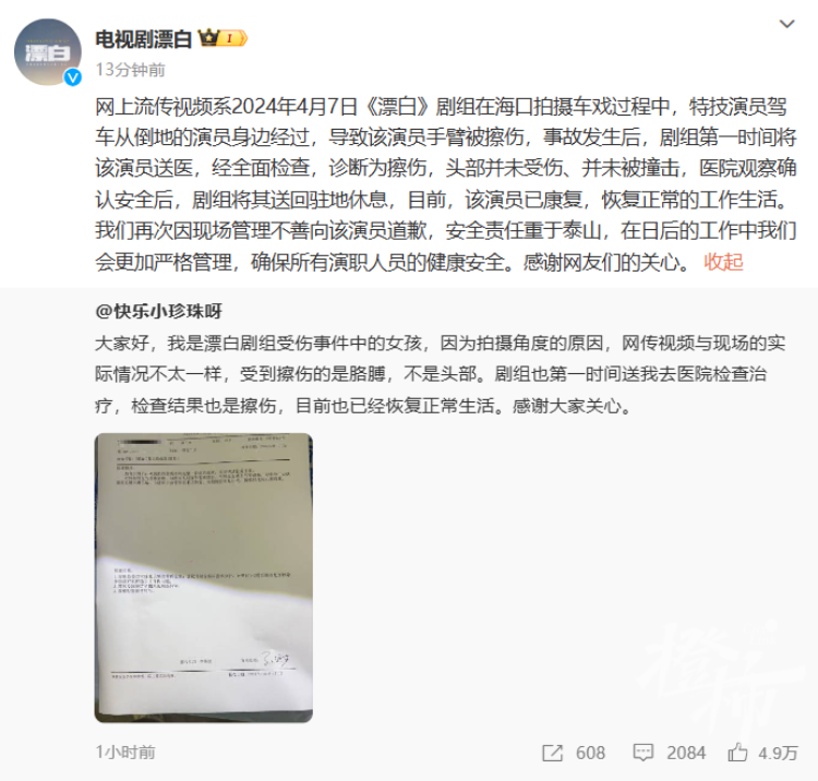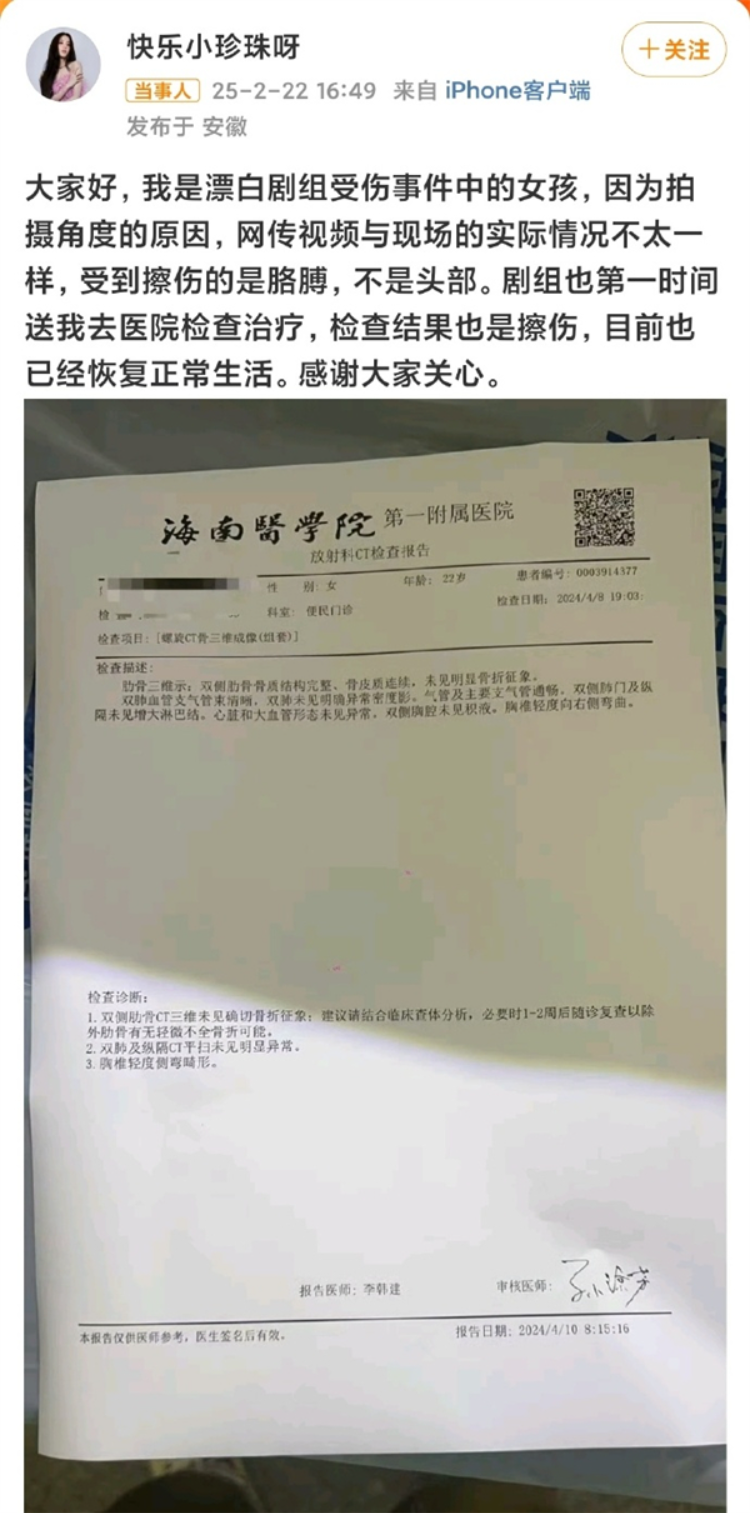 随后,有自称《漂白》剧组受伤事件中的女孩发文回答,还晒出了病院查验阐发:“因为拍摄角度的原因,网传视频与现场的实质情况不太相同,受到擦伤的是胳背,不是头部。剧组也第一时辰送我去病院查验挽救,查验成果亦然擦伤,现在也照旧归附平日糊口。感谢宇宙关注。 ”